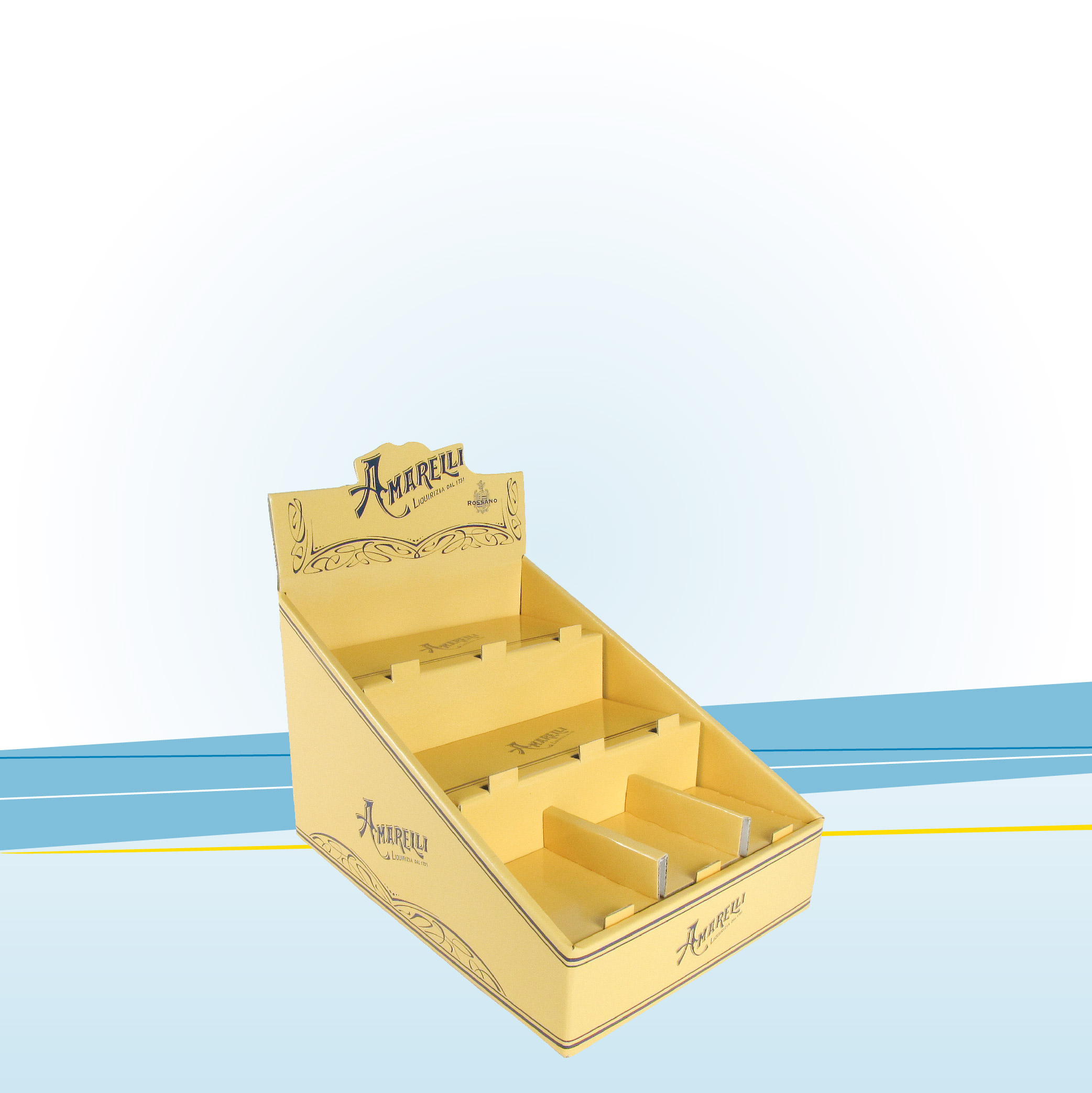 Dispenser in cartone ondulato, accoppiato a cartoncino stampato a colori, con plastica protettiva. È inclusa una scaletta di sostegno dei prodotti che ne migliora la visibilità.