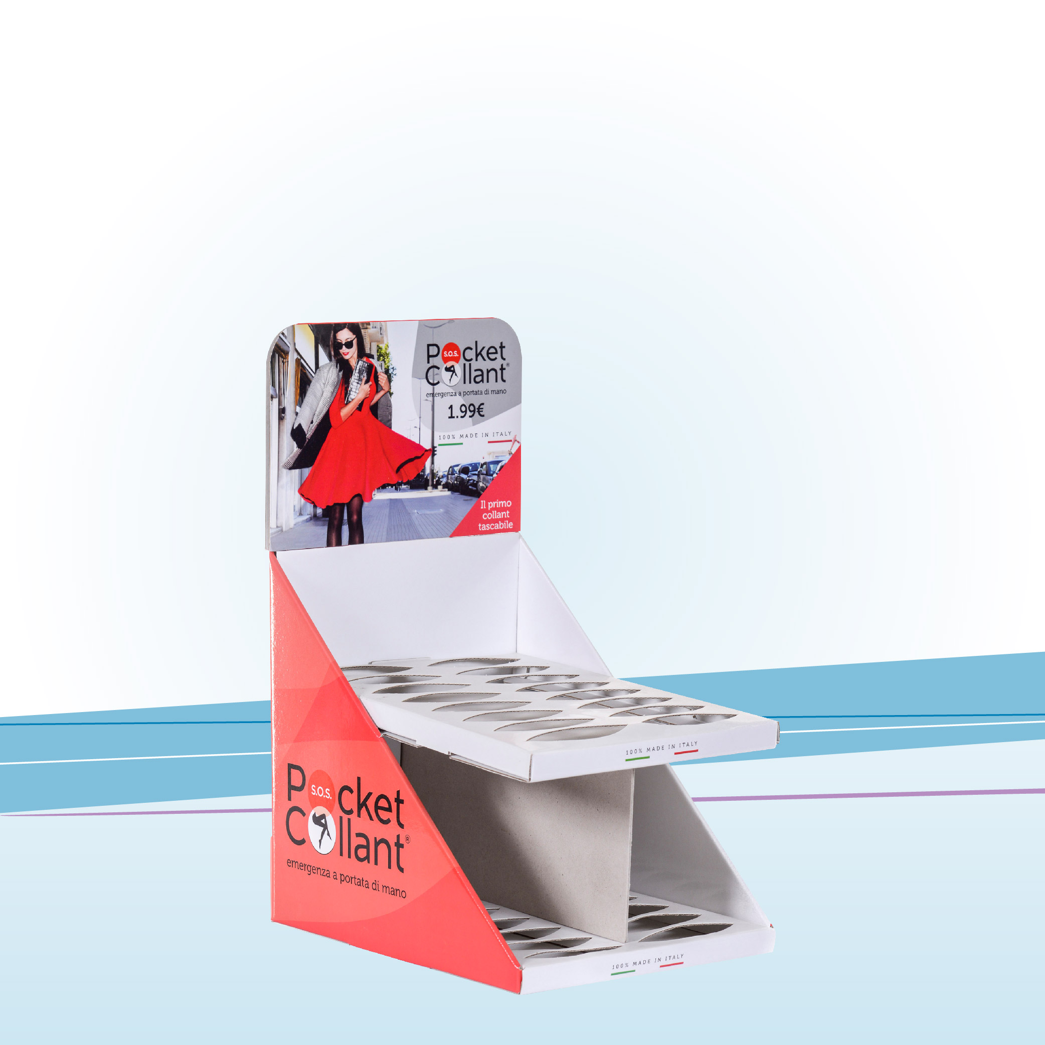Espositore da banco a 2 ripiani con alveoli sagomati per l’esposizione dei prodotti. La struttura è in cartone microonda accoppiato a cartoncino stampato a 4 colori con plastica protettiva.