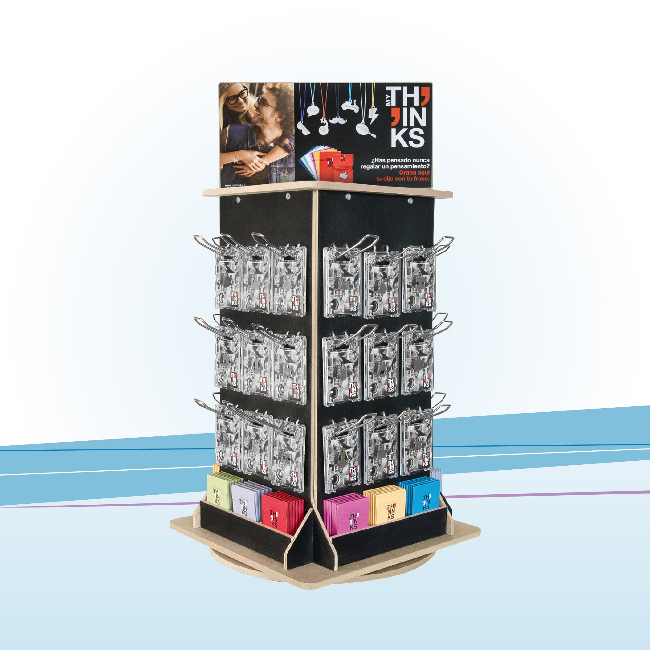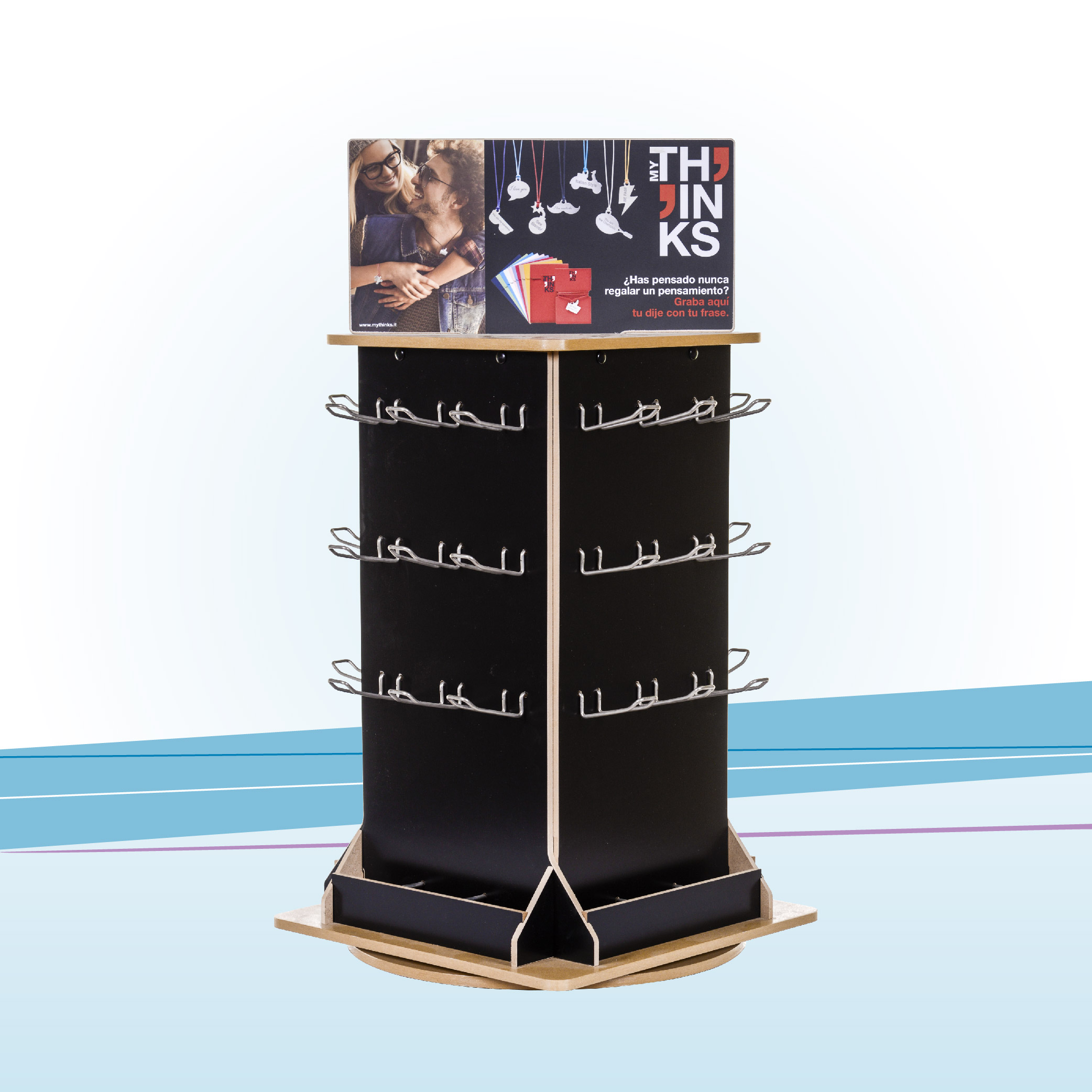 Espositore da terra in fibra di legno MDF per prodotti in appesi accoppiato stampa litografica a colori con plastica protettiva.