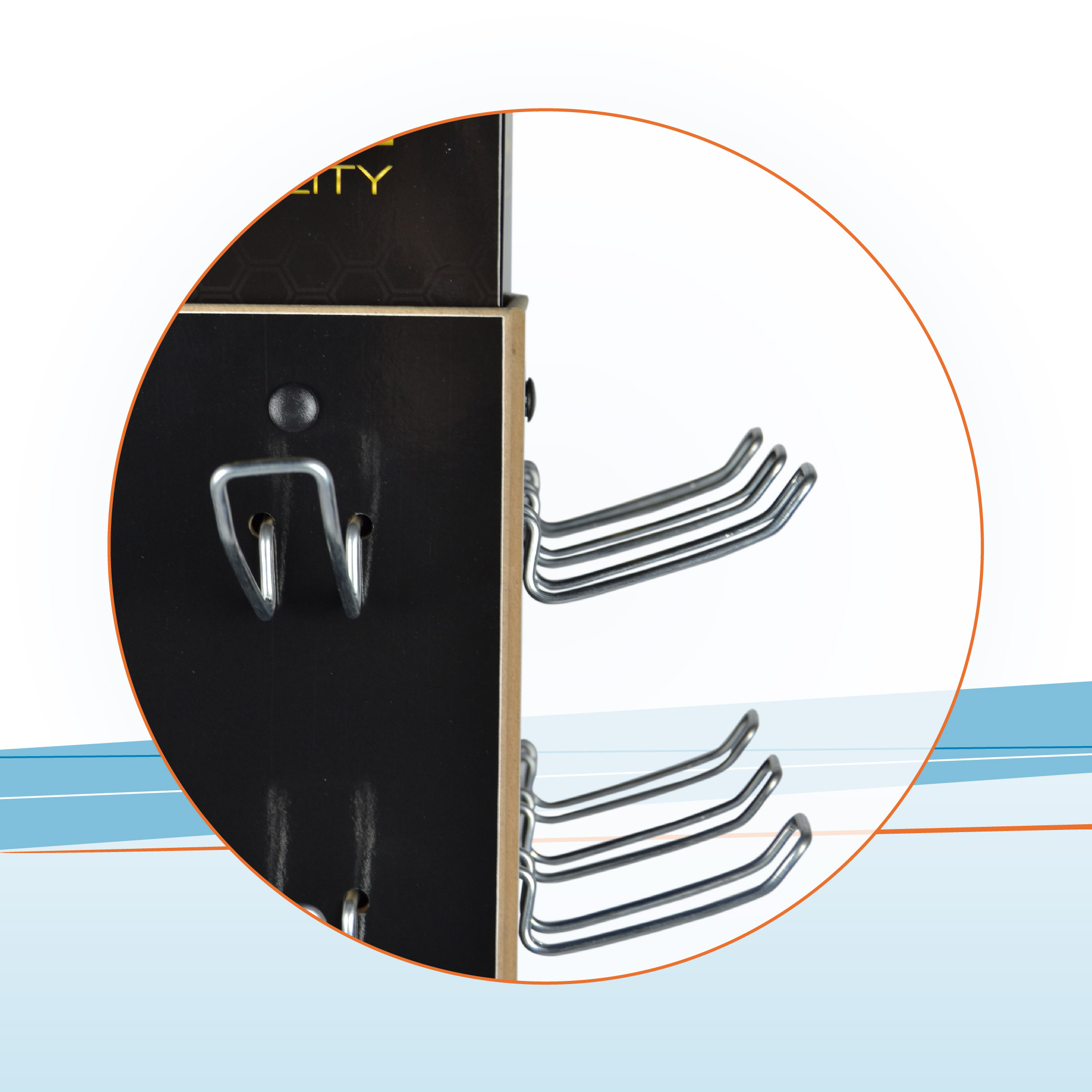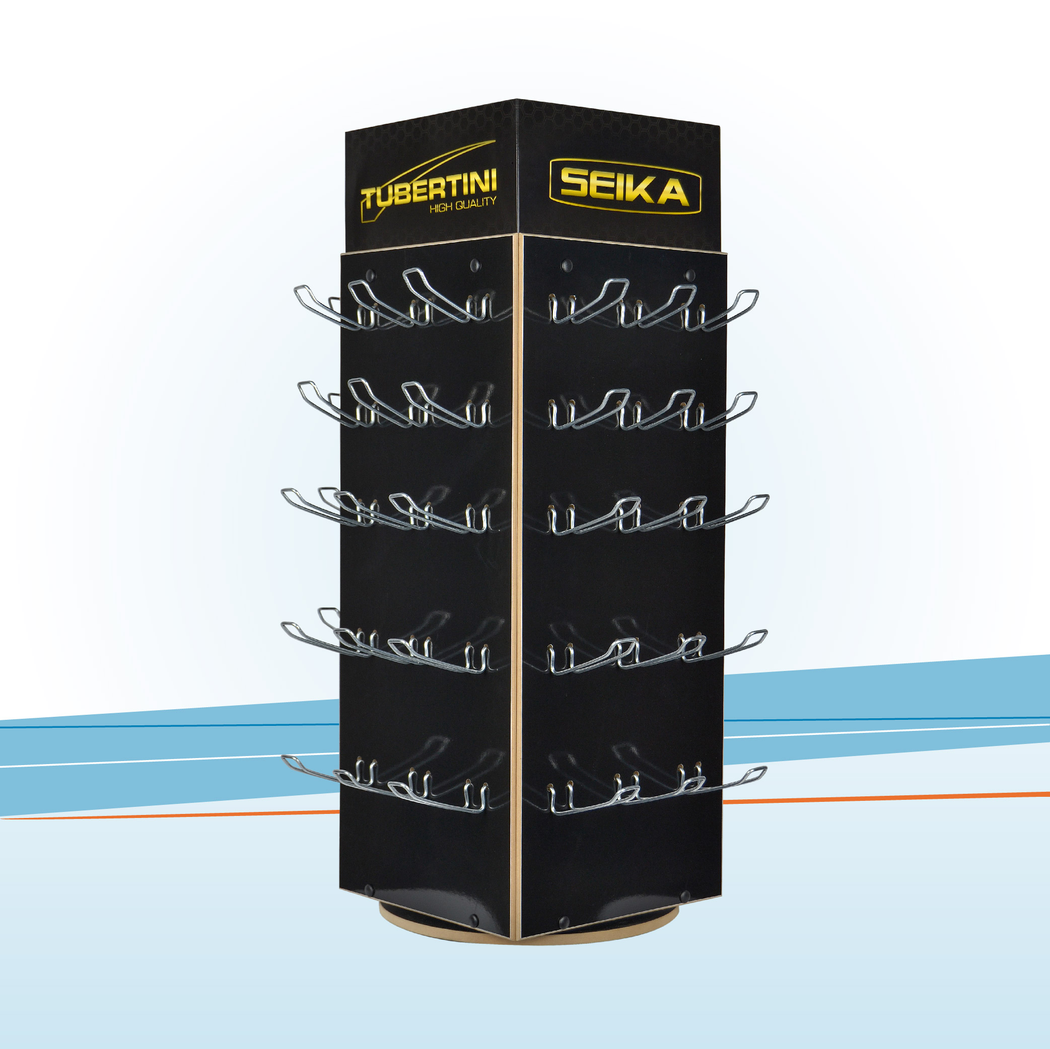Espositore in fibra di legno MDF, girevole, con fori per ganci porta prodotto. Crowner in cartoncino stampato a colori con plastica protettiva lucida.