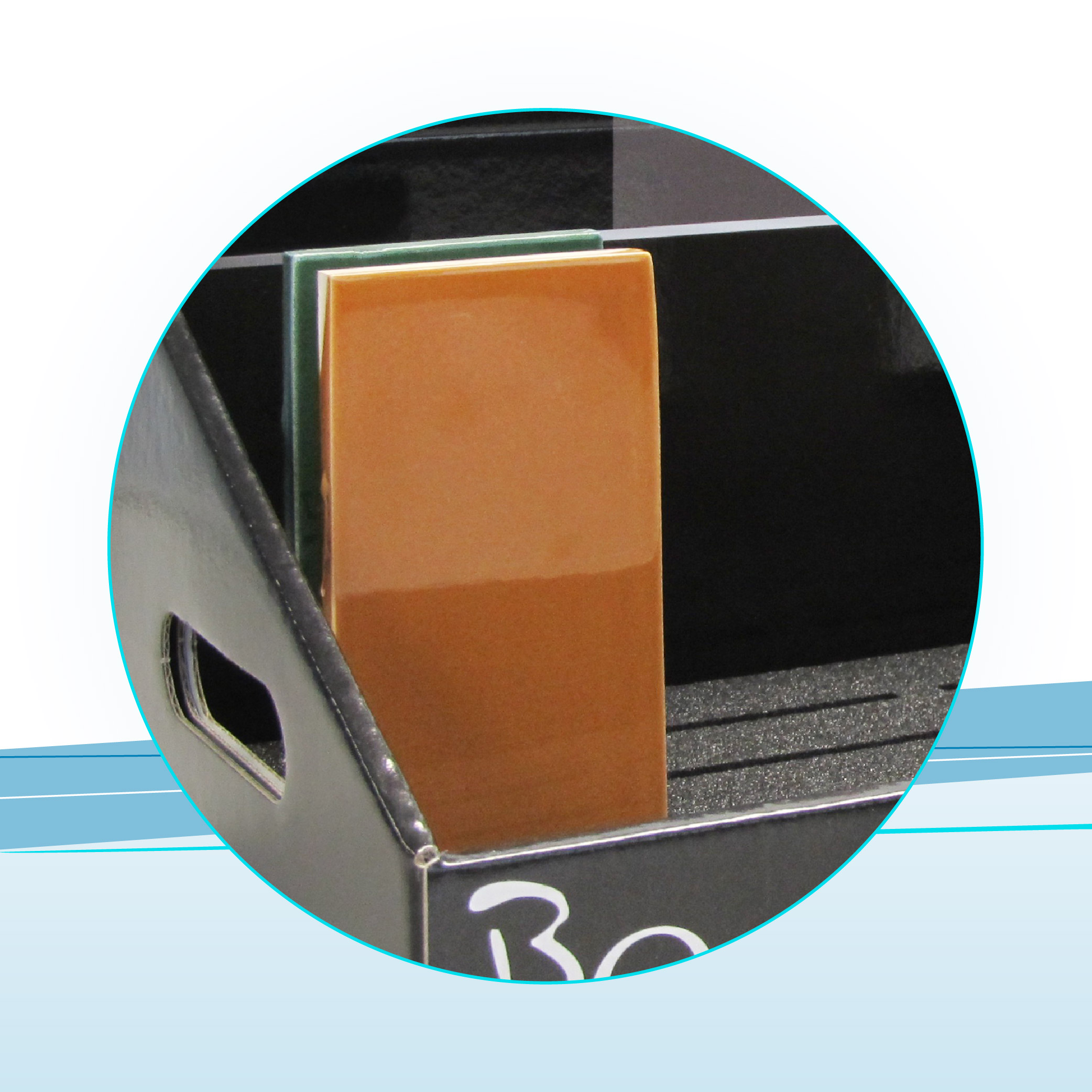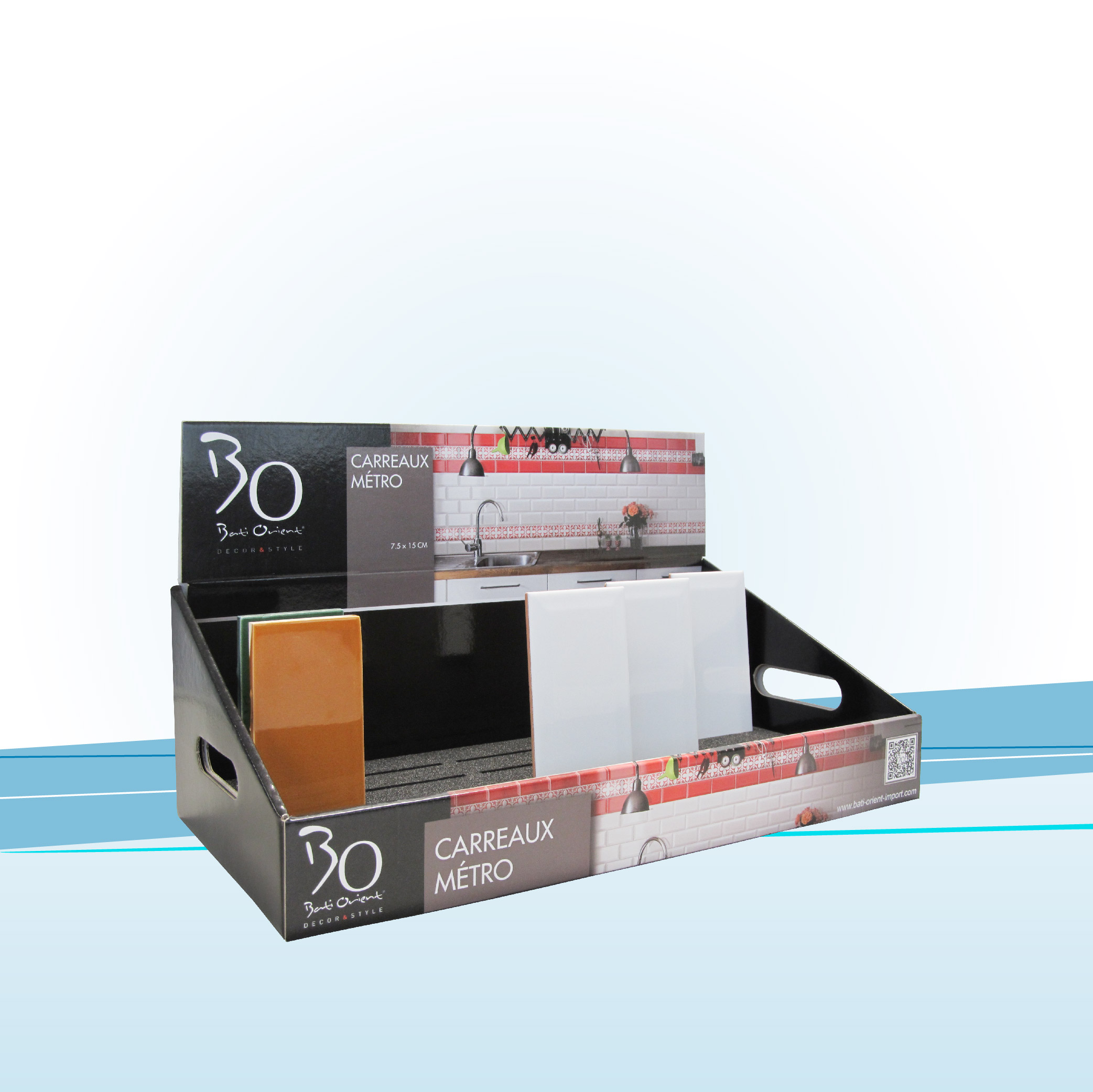 Espositore da banco automontante in microonda accoppiata a cartoncino stampato a colori con plastica protettiva. Rastrelliera interna in spugna nera con fori per il posizionamento delle piatrelle.
