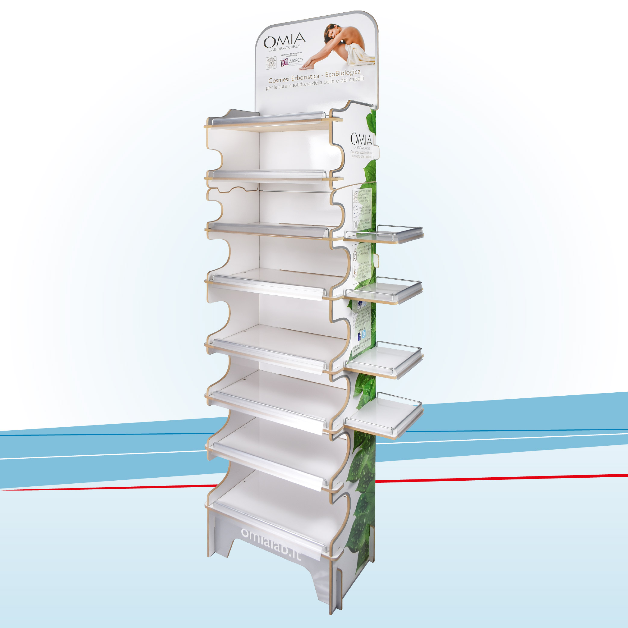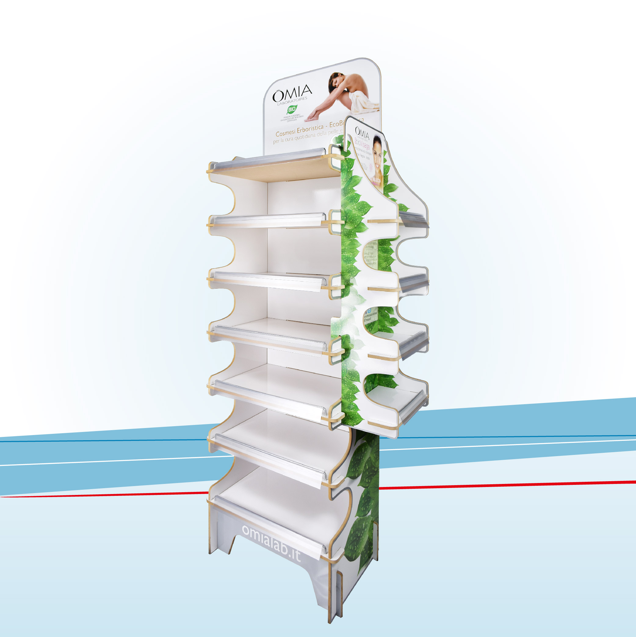Espositore da terra in fibra di legno MDF per prodotti in appoggio accoppiato stampa litografica a colori con plastica protettiva.