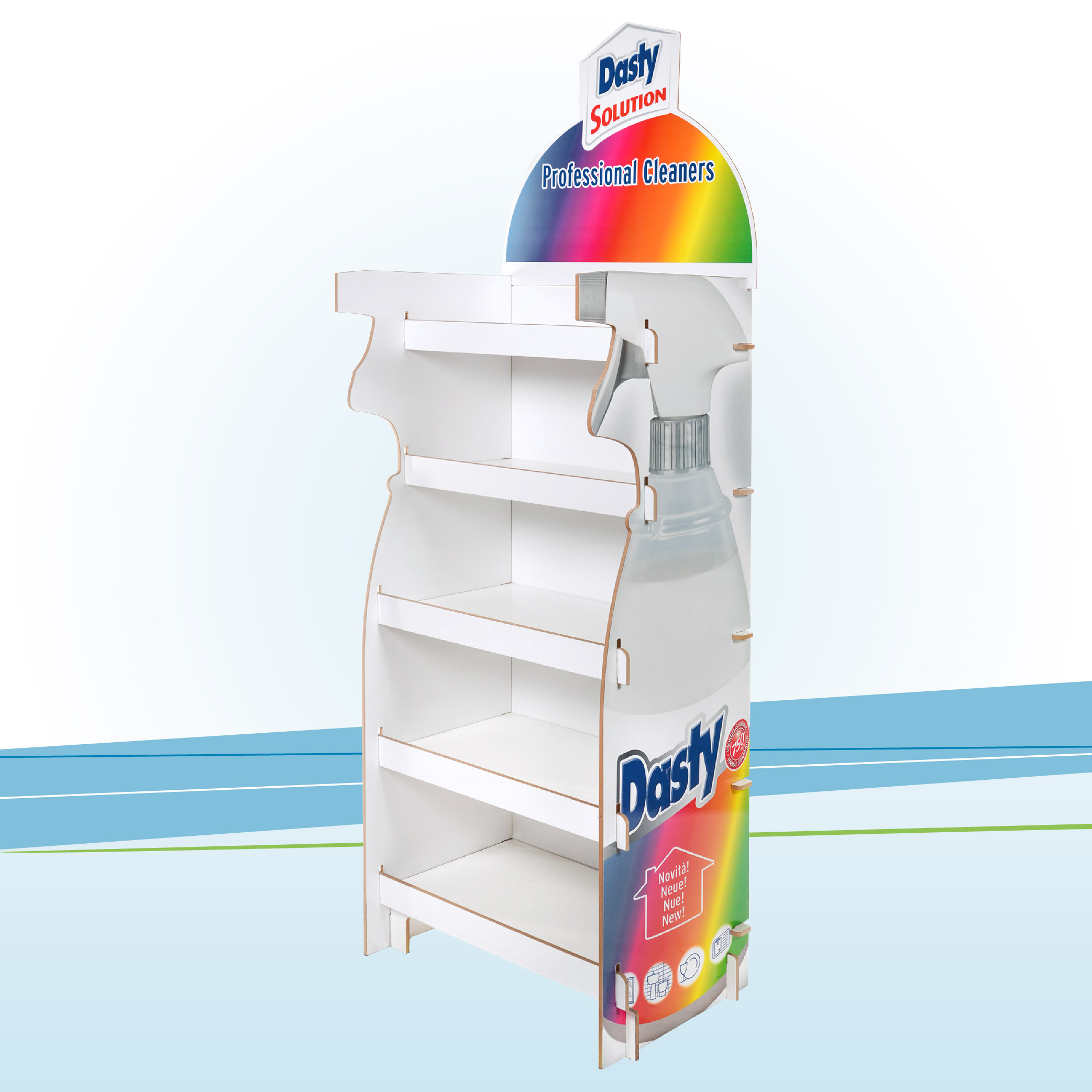 Espositore da terra in fibra di legno MDF per prodotti in appoggio accoppiato stampa litografica a colori con plastica protettiva.