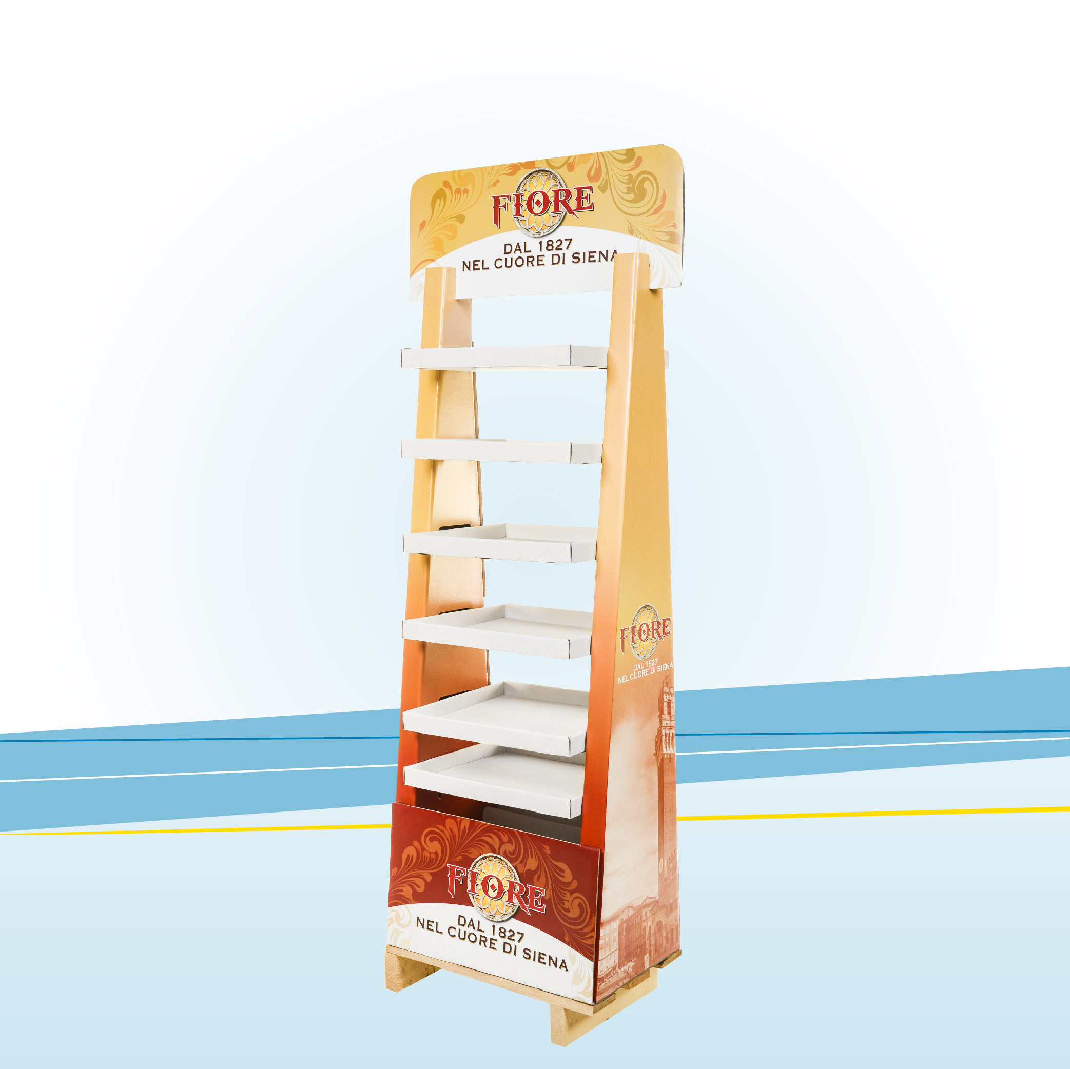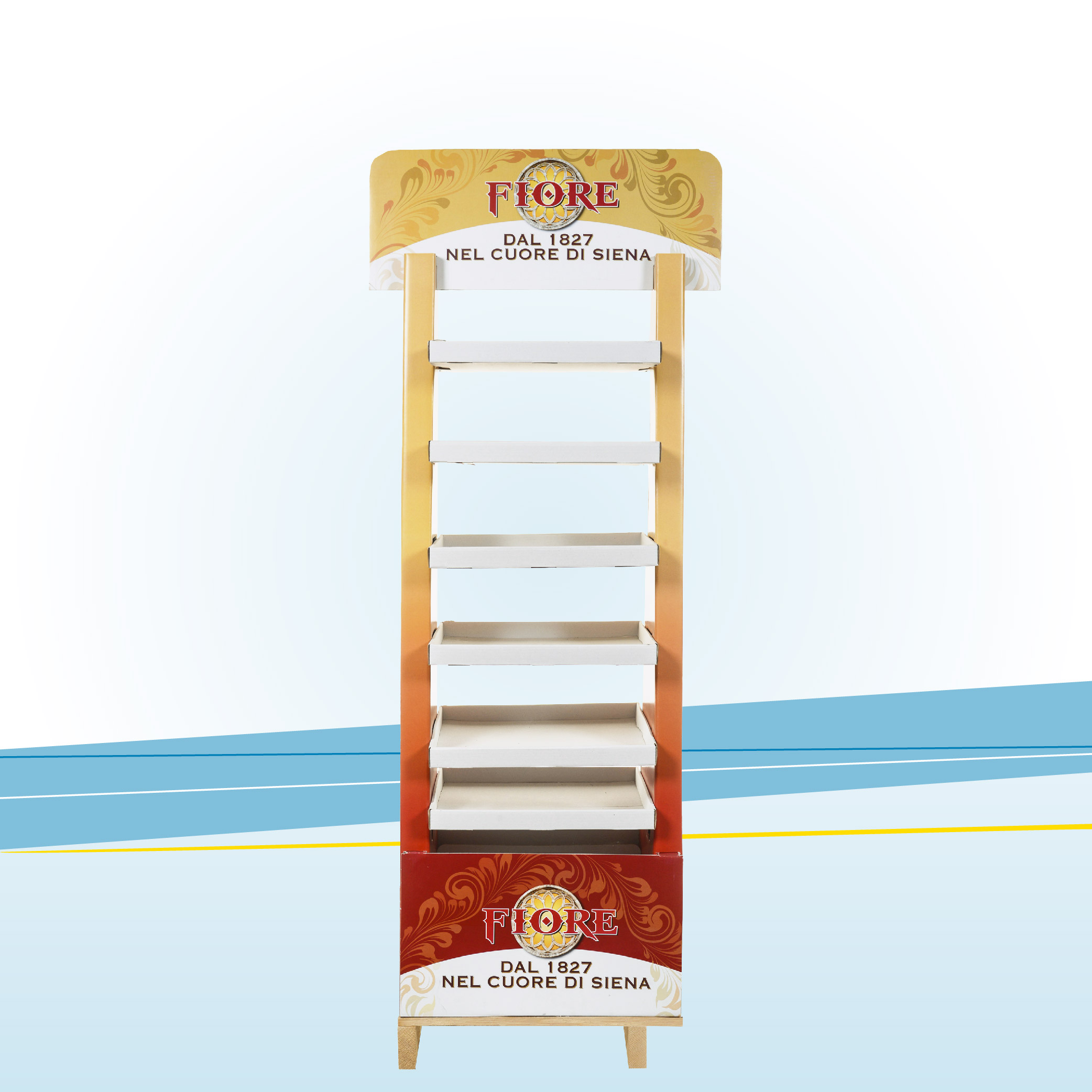 Espositore da terra bifacciale in cartone per prodotti in appoggio, accoppiato a stampa litografica a colori con plastica protettiva.