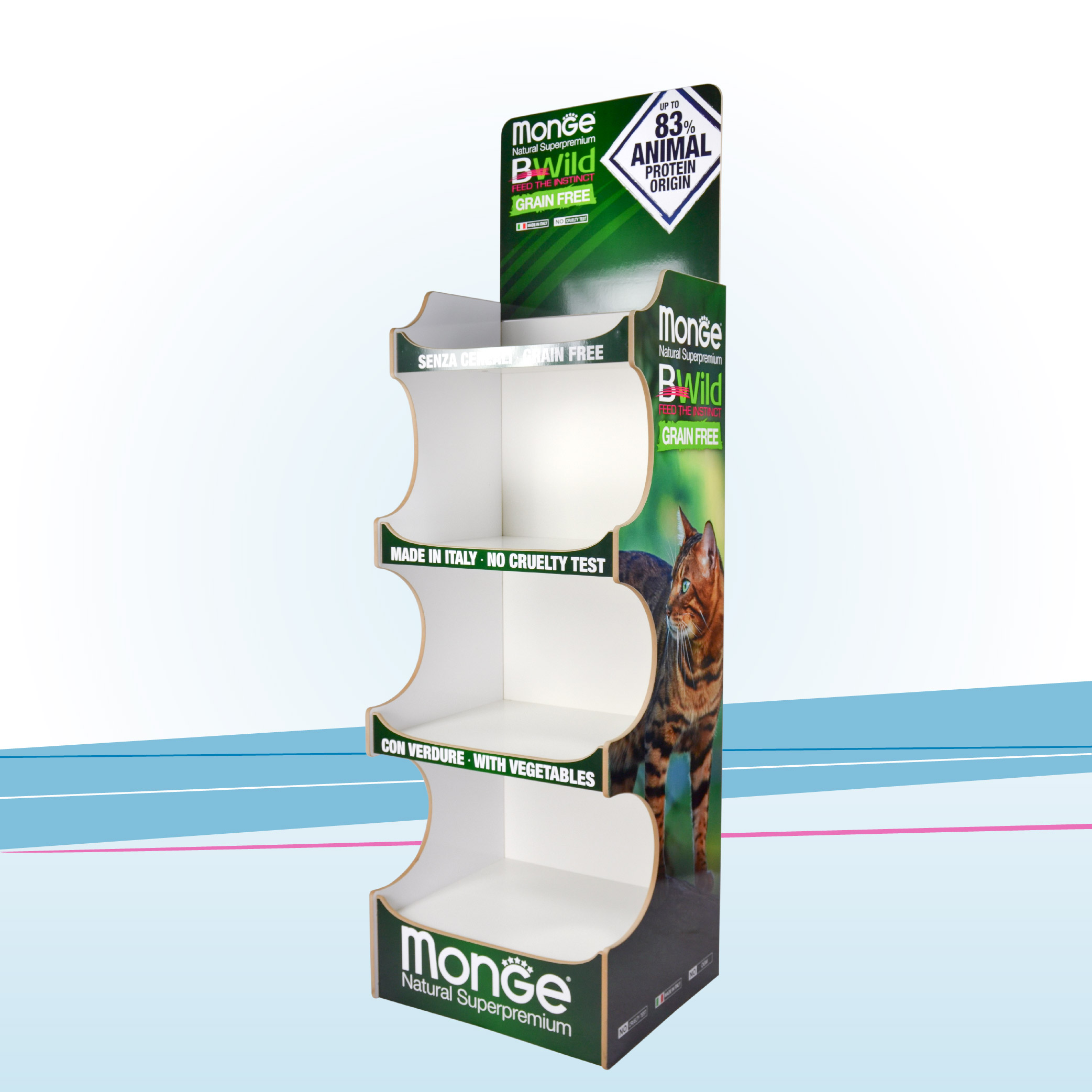 Espositore da terra in fibra di legno MDF per prodotti in appoggio accoppiato stampa litografica a colori con plastica protettiva.