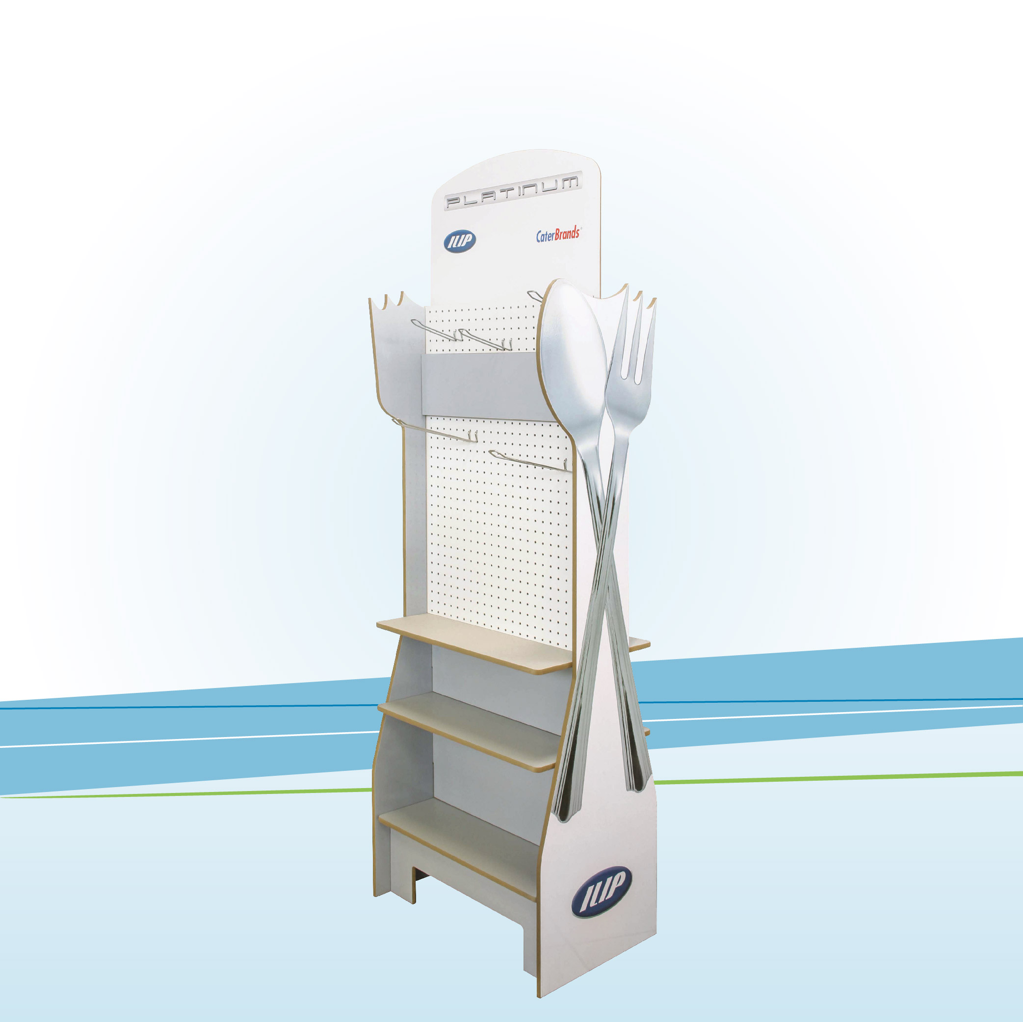 Espositore da terra in fibra di legno MDF per prodotti sia appesi che in appoggio accoppiato stampa litografica a colori con plastica protettiva.