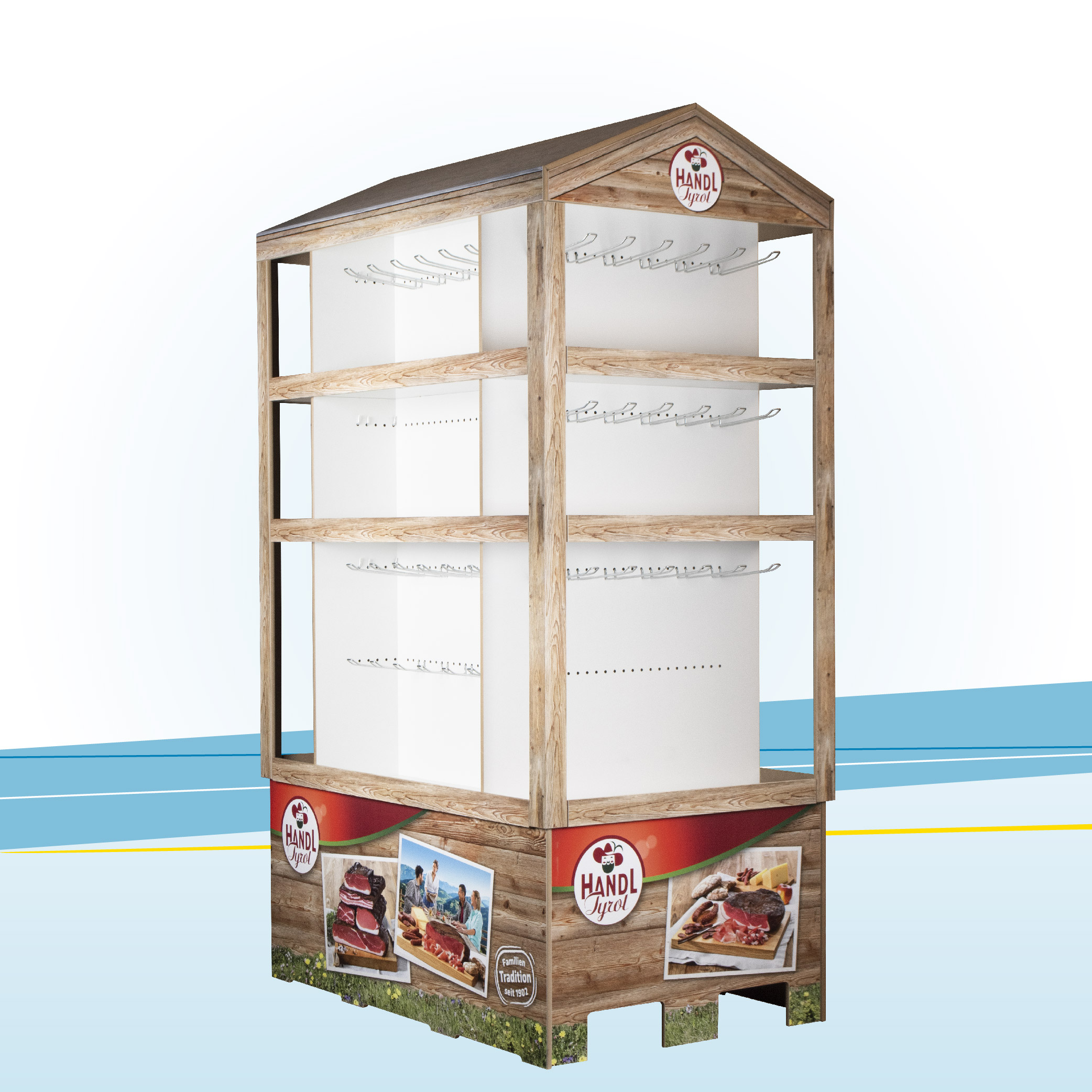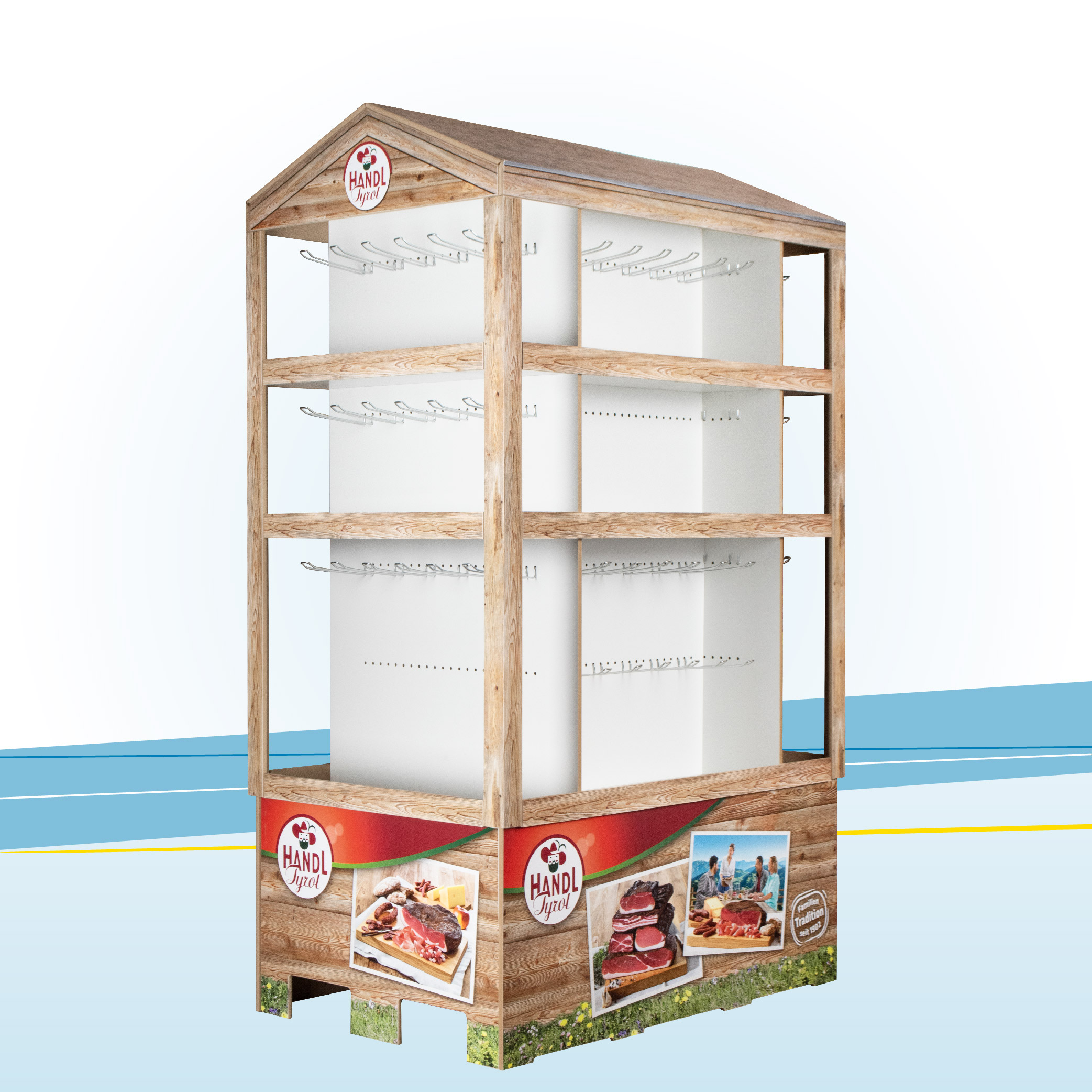 Espositore da terra in fibra di legno MDF per prodotti appesi accoppiato stampa litografica a colori con plastica protettiva.