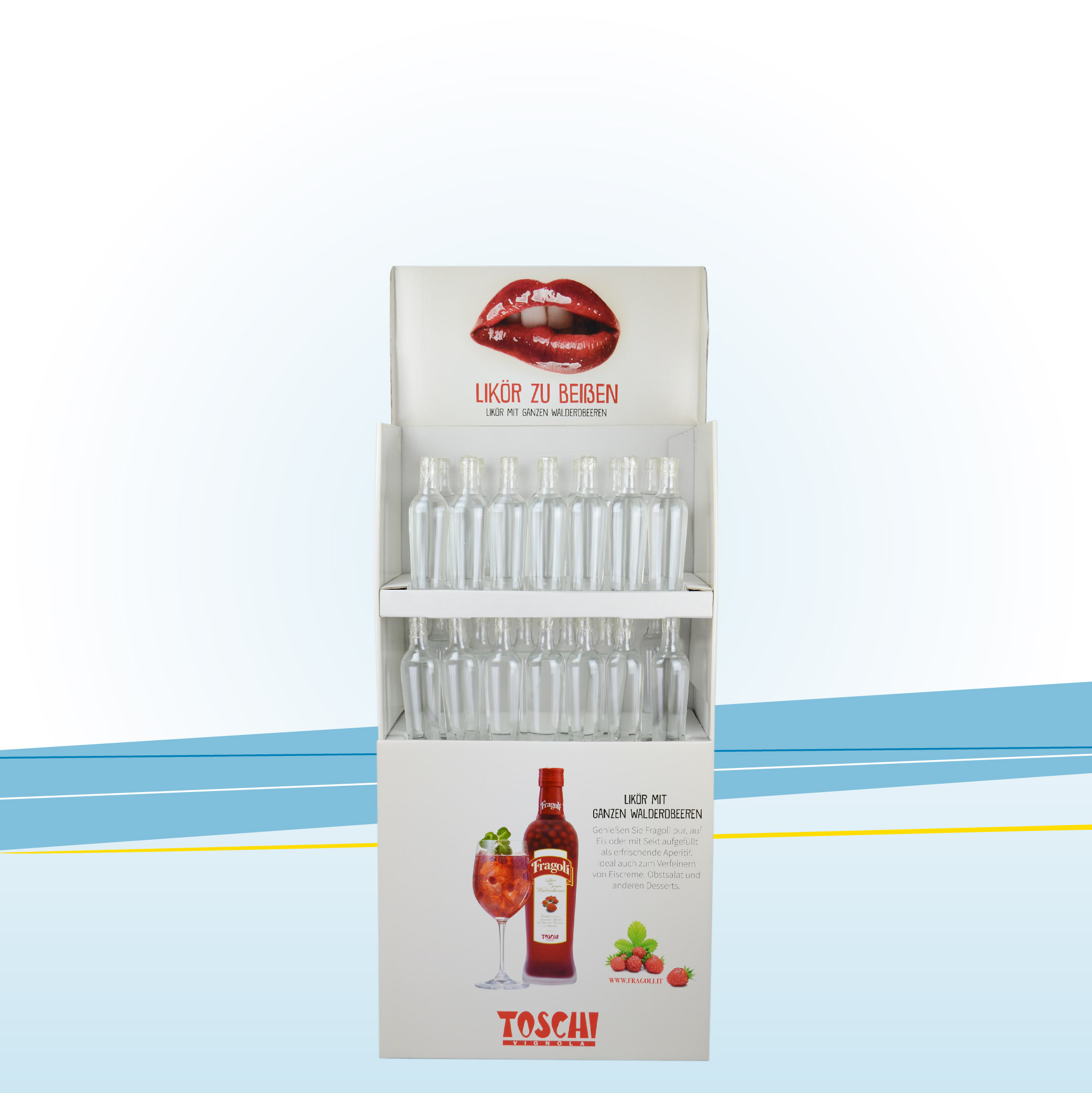 Espositore da terra monofacciale in cartone per bottiglie in appoggio, accoppiato a stampa litografica a colori con plastica protettiva lucida.