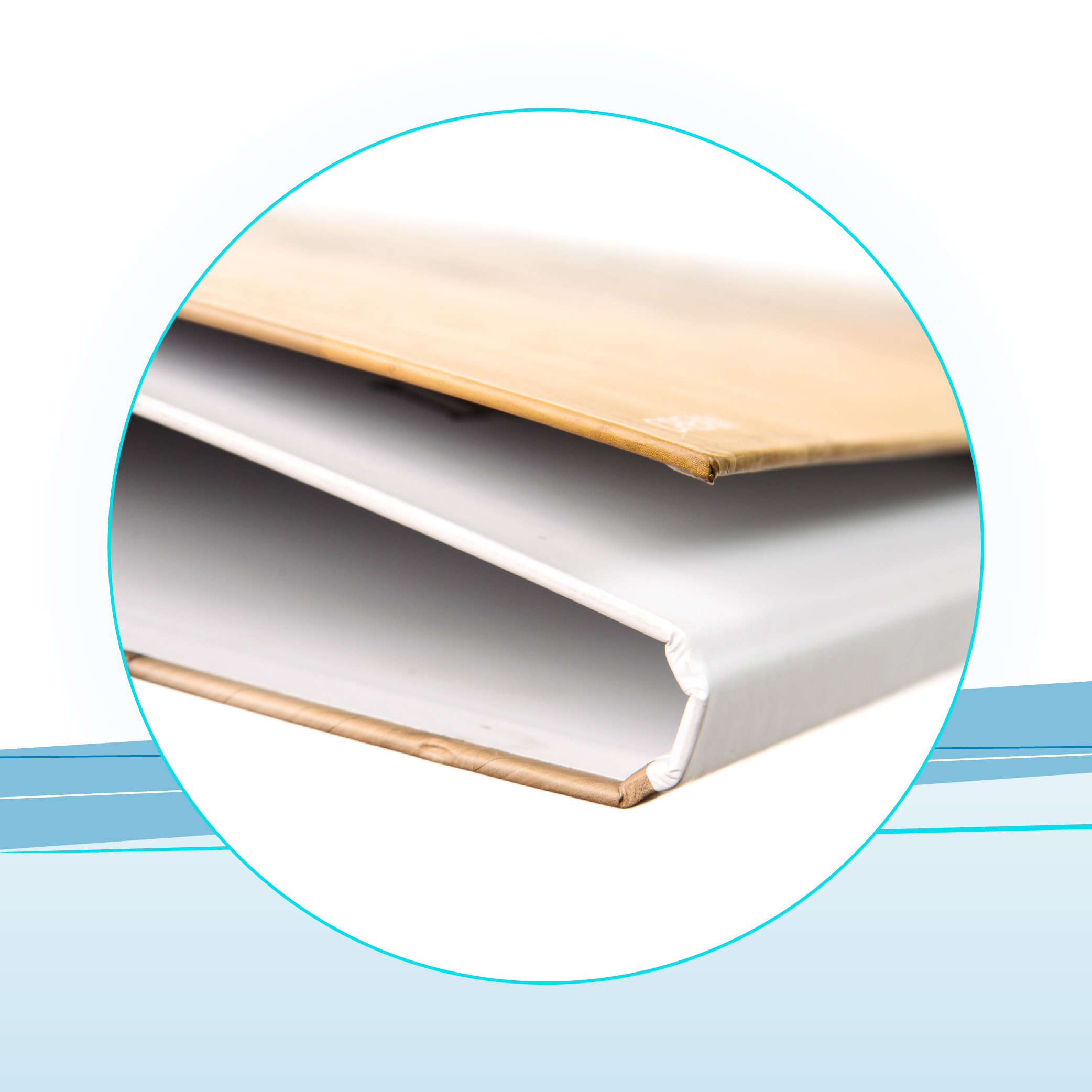 Cartella in cartone rivestito con carta stampata a colori e plastica protettiva. La maniglia per il trasporto è di tipologia “a sfilo”.