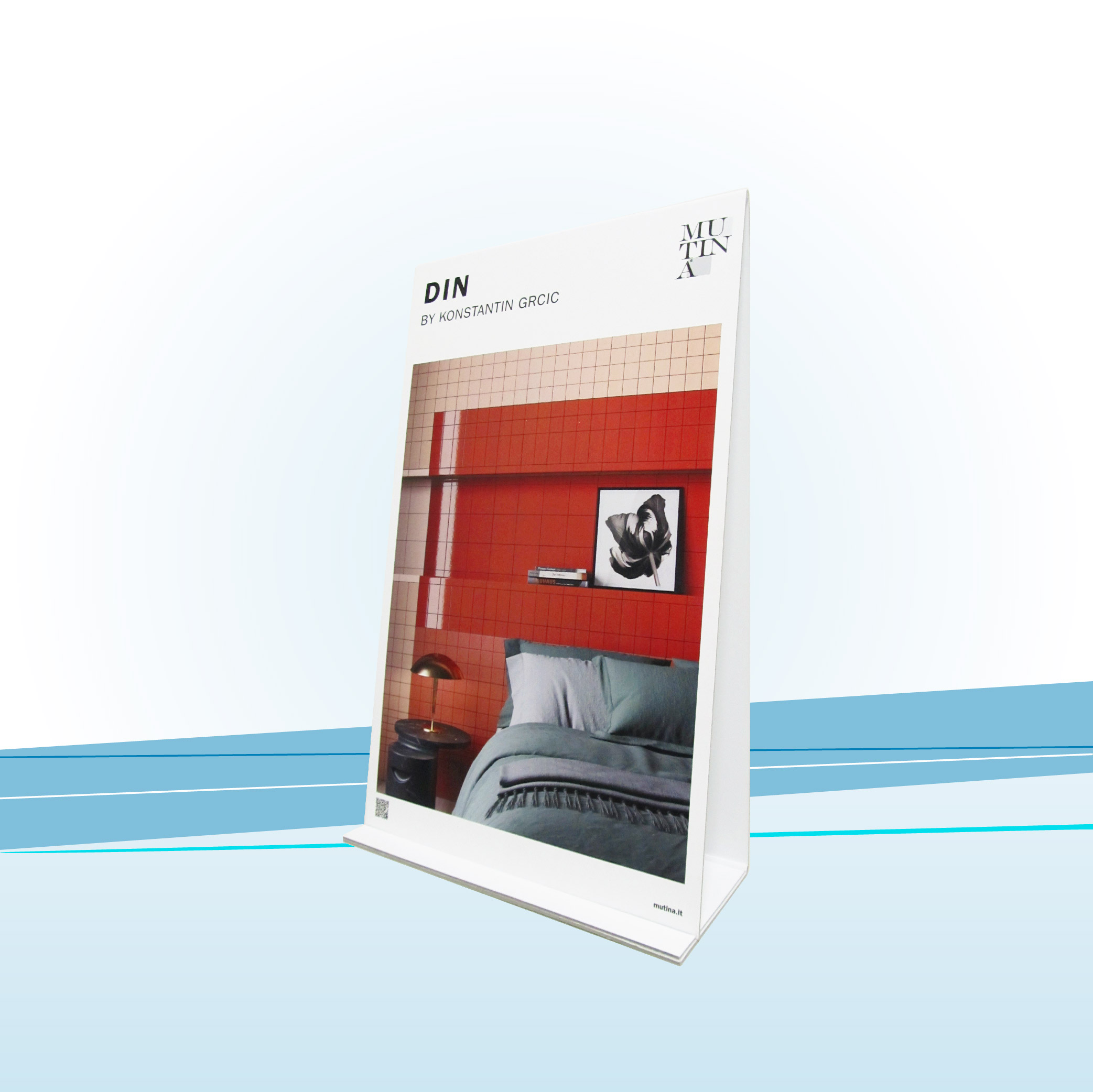 Cartello vetrina in cartone rivestito con carta stampata a colori e protetta con plastica lucida. La particolare struttura autoportante, di facile incastro, gli permette di rimanere in piedi ed avere due facce da esporre.