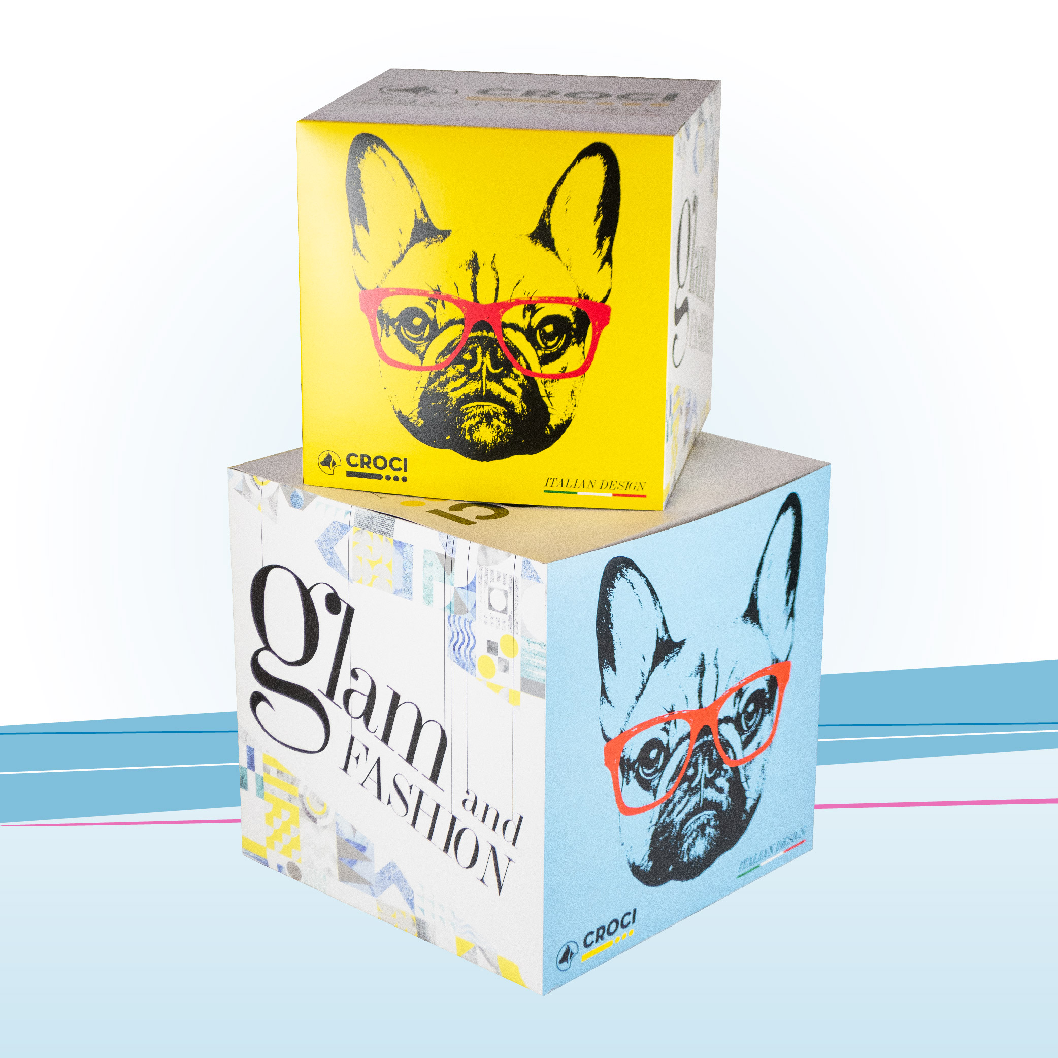Cartello vetrina dall’originale forma di cubo, in cartoncino stampato a colori con vernice protettiva.