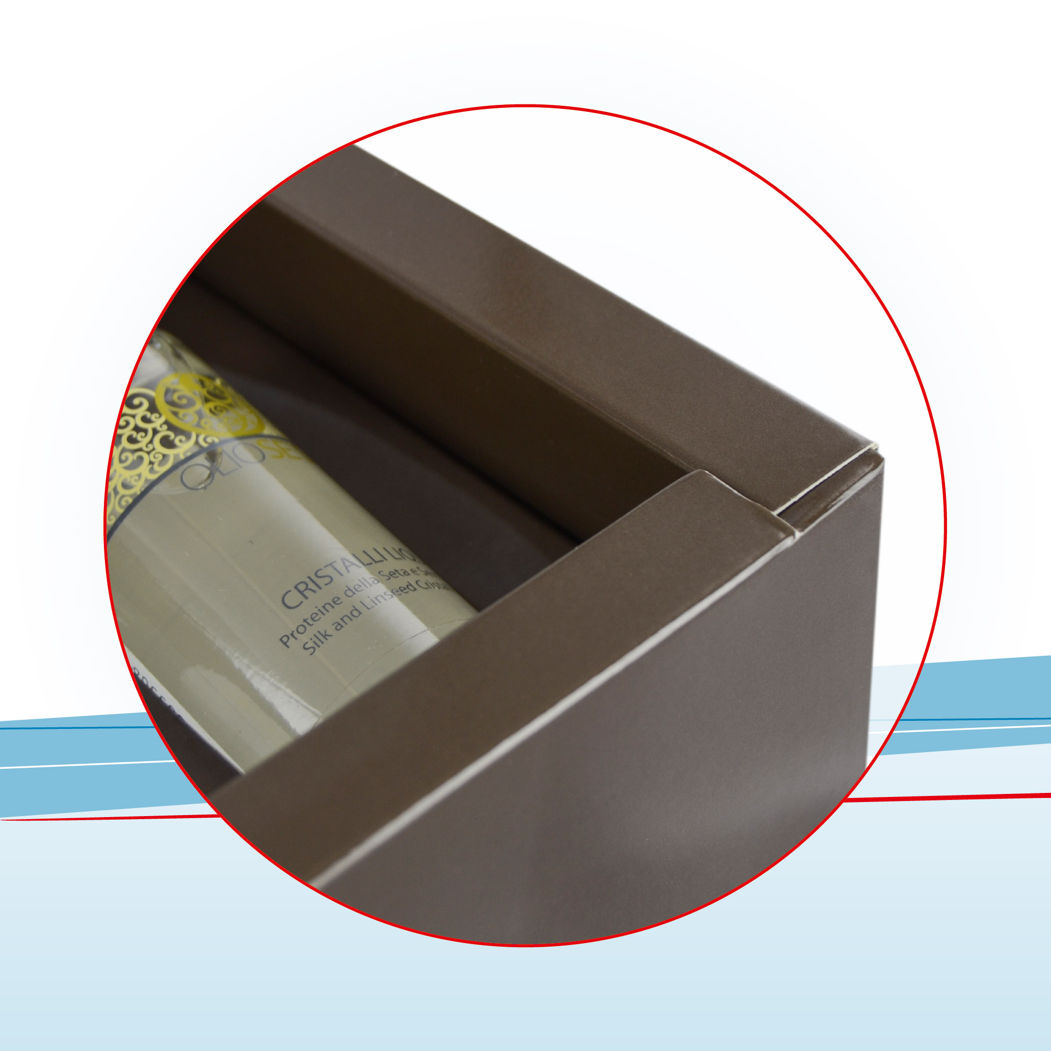 Cofanetto in cartoncino stampato a colori e protetto con plastica protettiva lucida. All’interno un alveolo, in cartoncino, stampato e sagomato appositamente per mantenere fermi i prodotti.