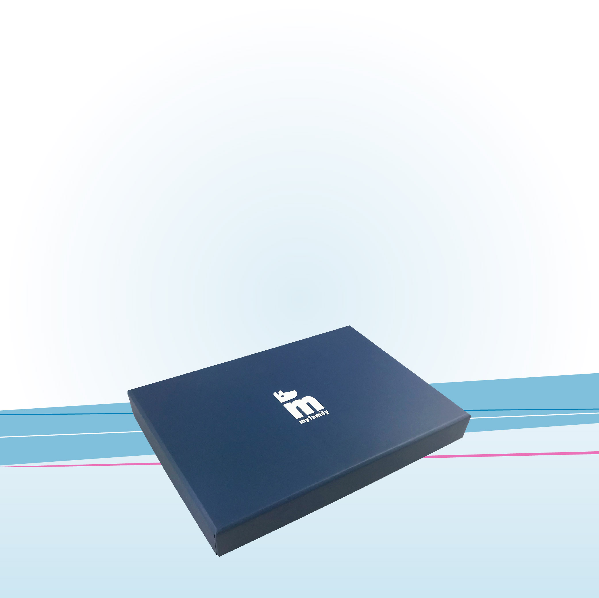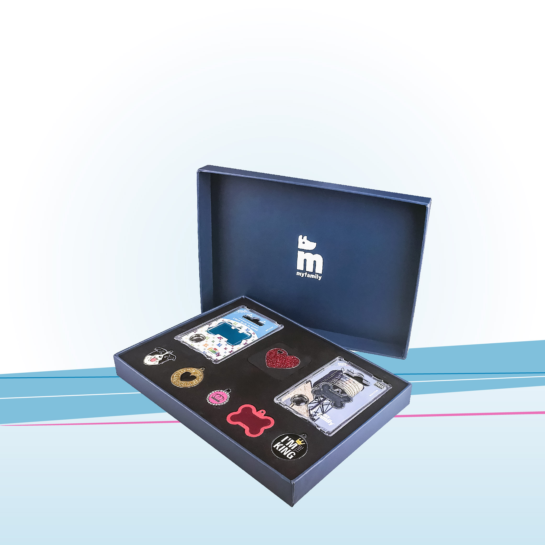 Cofanetto composto da base e coperchio in cartone, rivestiti con carta stampata a colori, protetta con plastica opaca. All’interno un alveolo in gomma, sagomato in base ai prodotti.