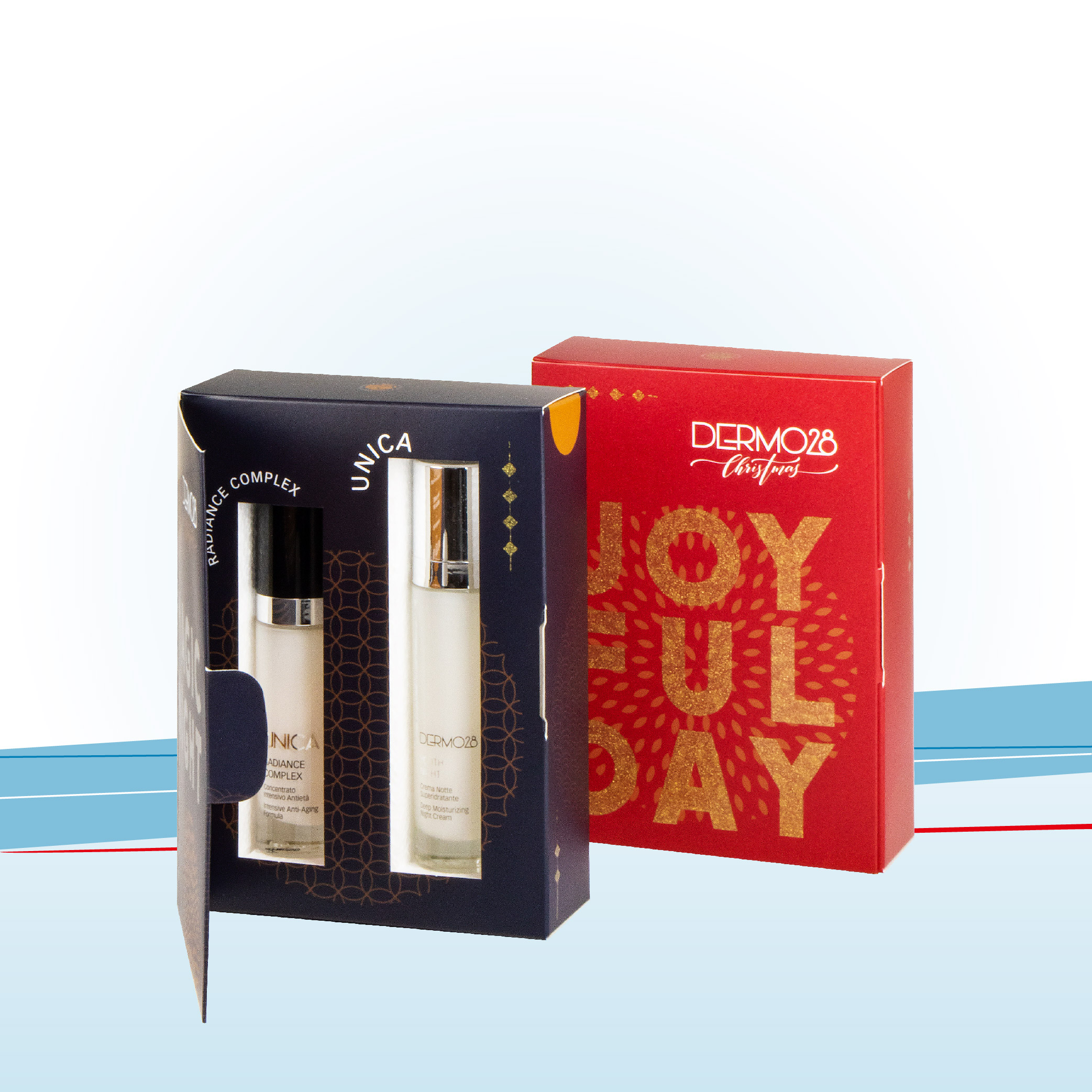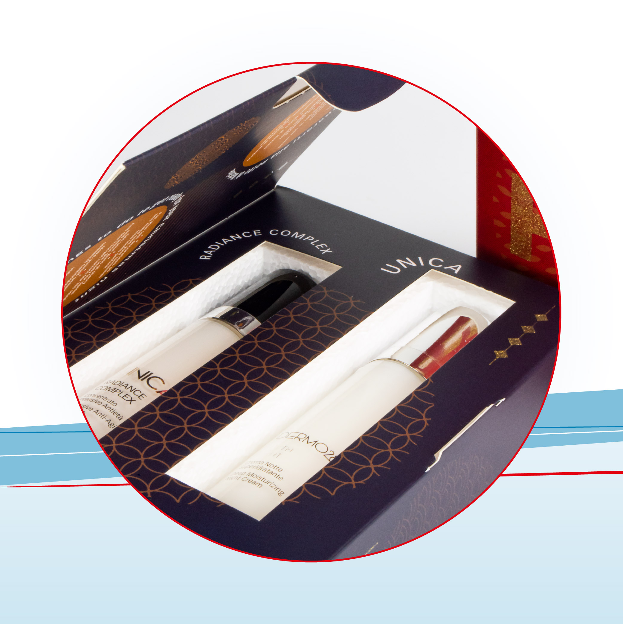 Astuccio in cartoncino per creme di bellezza, stampato a colori, protetto con plastica opaca ed impreziosito con vernice glitter color oro. La chiusura anteriore ad incastro permette la visione del prodotto interno. L’alveolo interno ferma prodotto è in polistirolo.