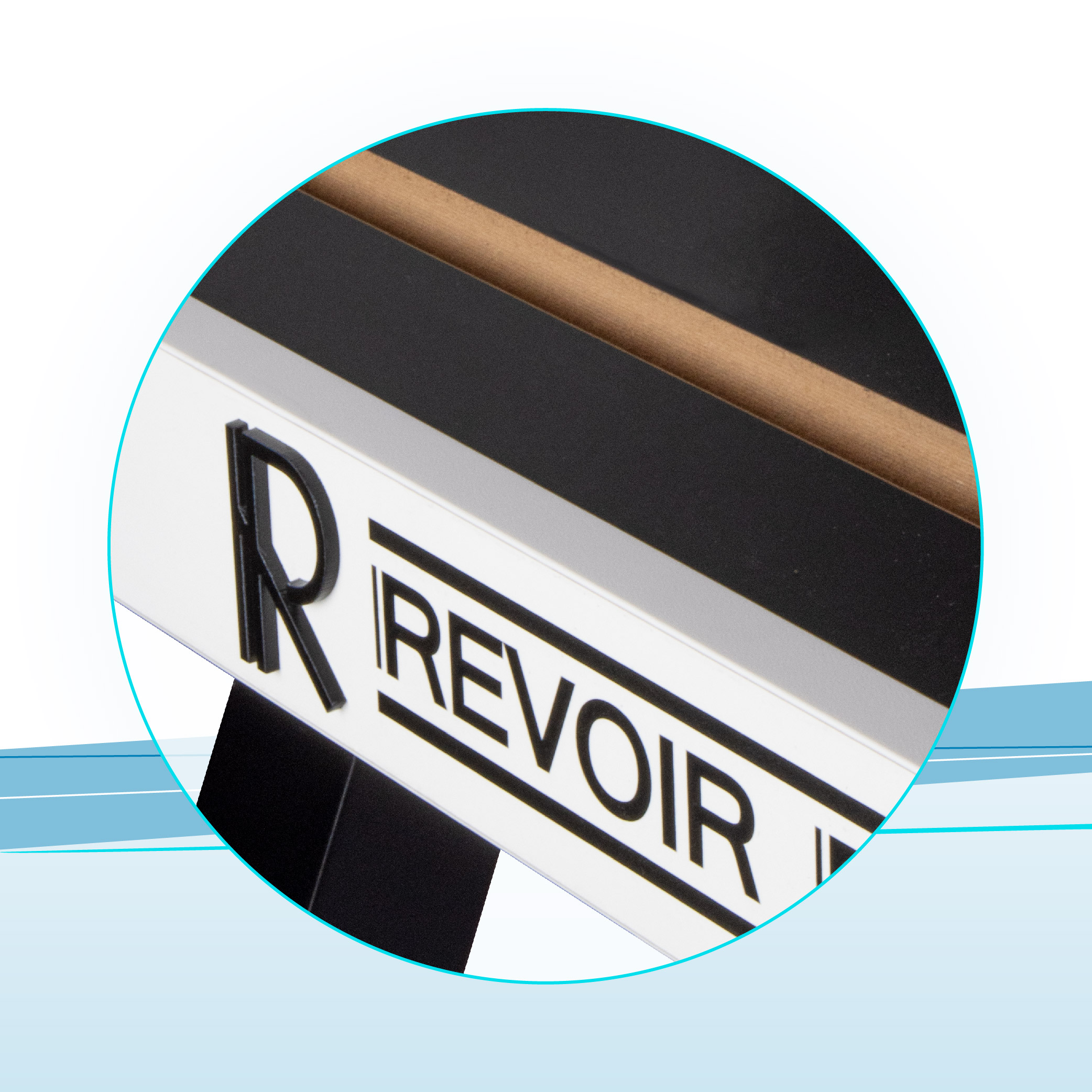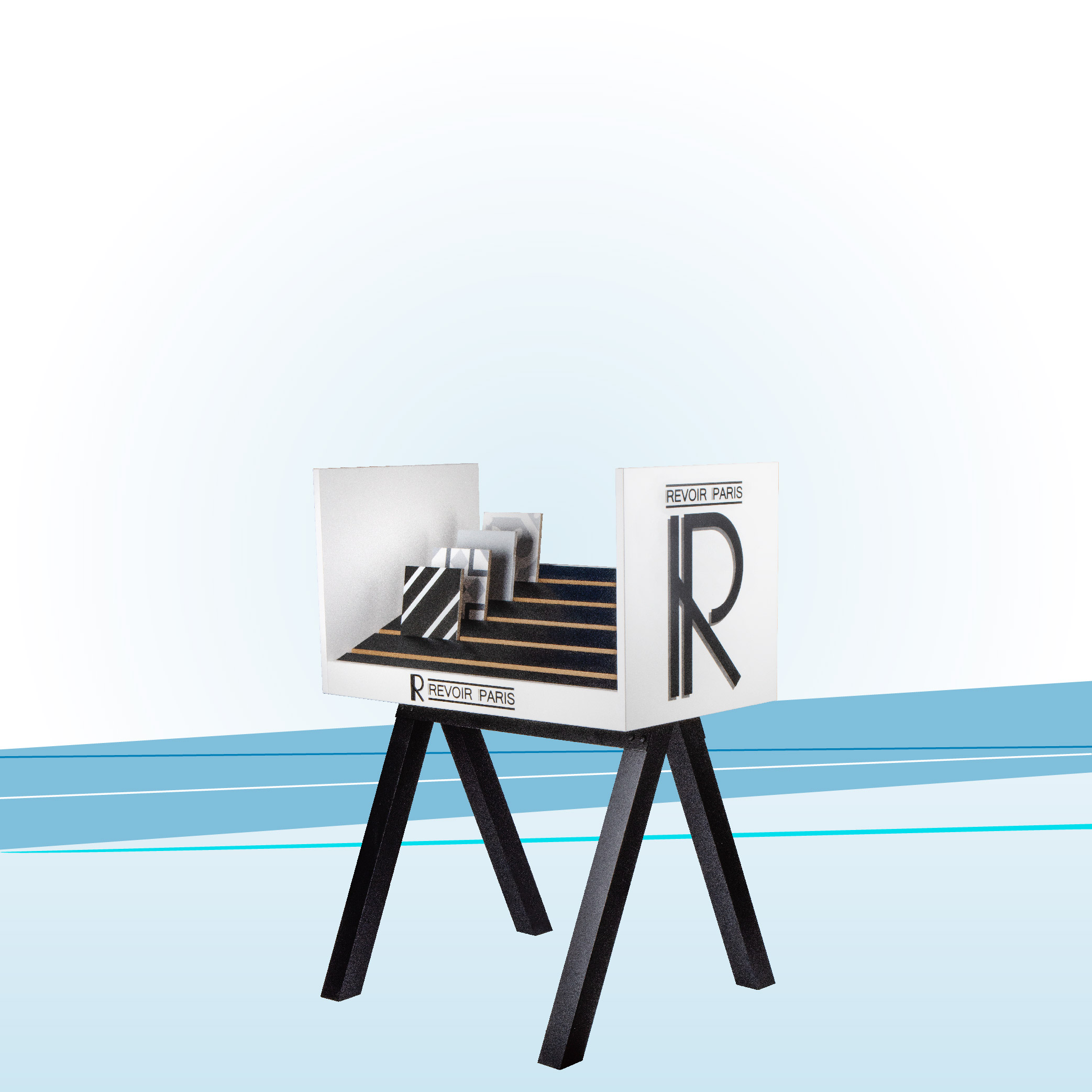 Espositore da terra in fibra di legno MDF nobilitato e verniciato, per prodotti in appoggio. È stato stampato direttamente con processo UV e sul frontalino è stato applicato un logo a rilievo il Plexiglass nero.