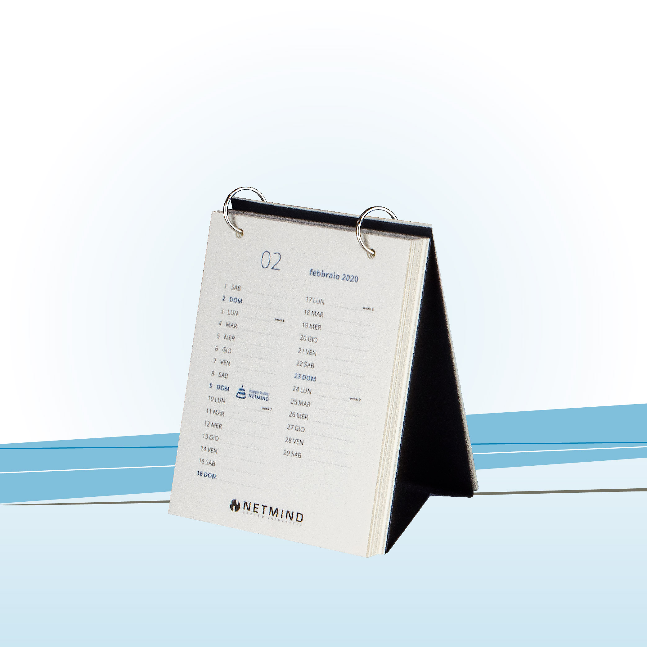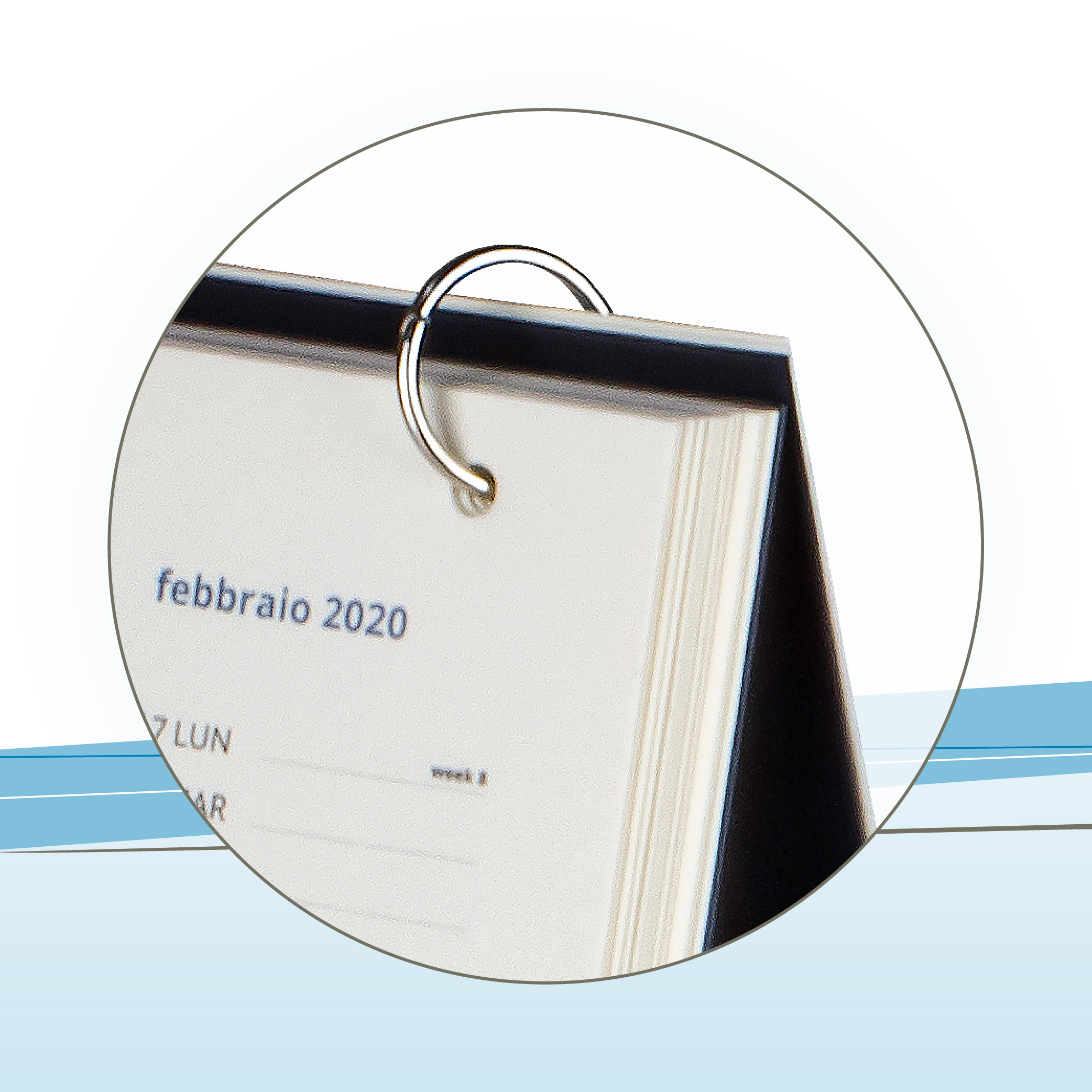 Calendario da tavolo composto da un piede in cartoncino colorato e dalle tavole dei mesi stampate a colori. Il calendario è rilegato con due anelli metallici.