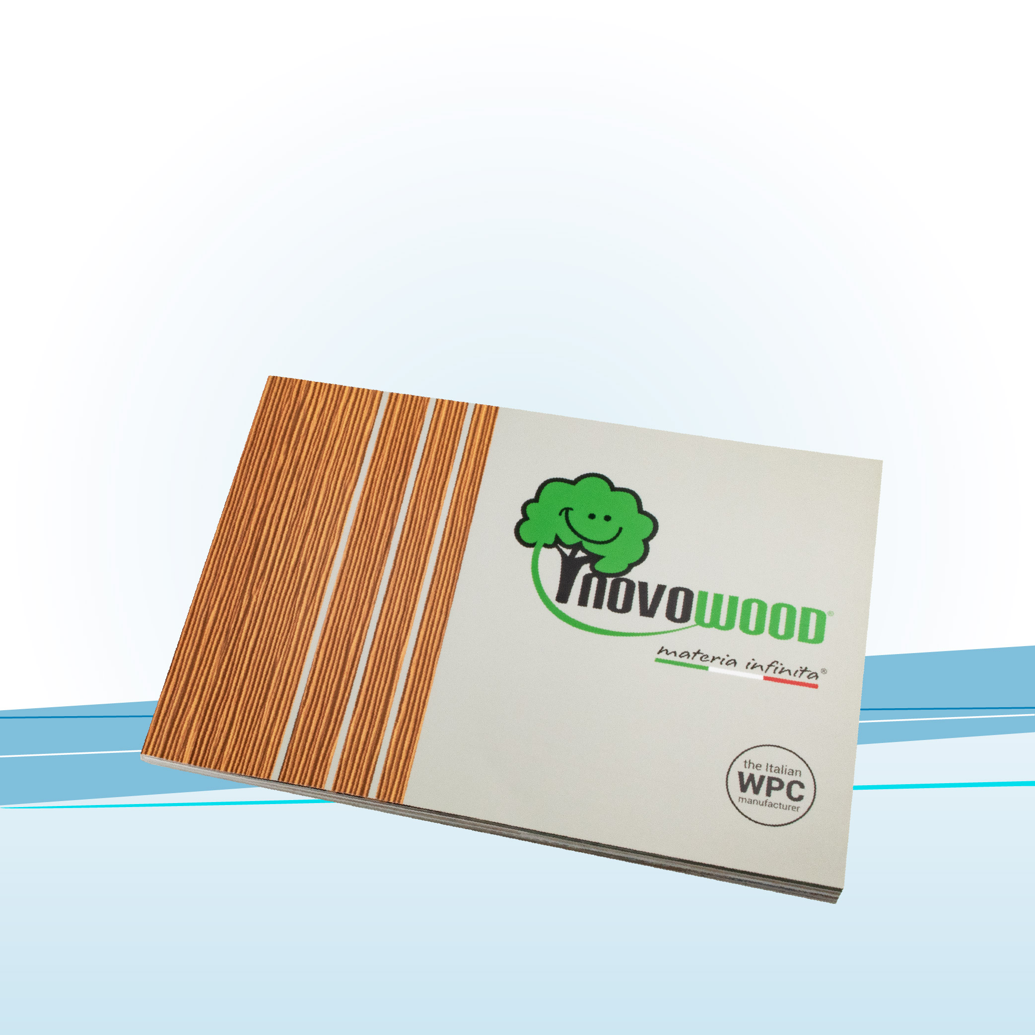 Catalogo composto da copertina e interno stampati a colori e rilegati a brossura. La copertina è plastificata opaca ed arricchita con una vernice spessorata per esaltare l’effetto legno.
