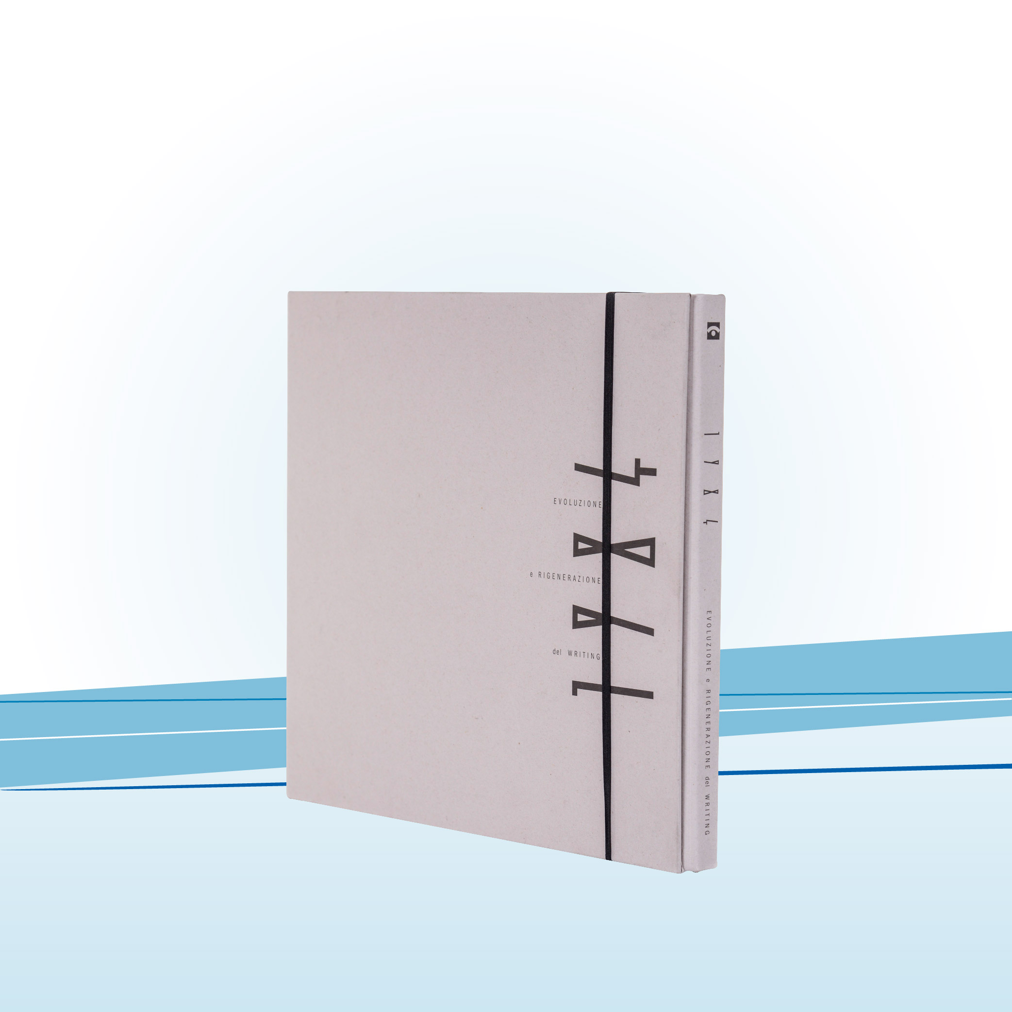 Volume realizzato per una mostra d’arte. È composto dalla copertina, stampata a 1 colore su cartoncino grigio, accoppiata e risvoltata su cartoncino da 2 mm e dall’interno, stampato a colori, composto da 4 opuscoli rilegati a punto metallico. Gli opuscoli interni sono attaccati alla copertina tramite degli elastici ed il volume completo viene chiuso anch’esso da un elastico.